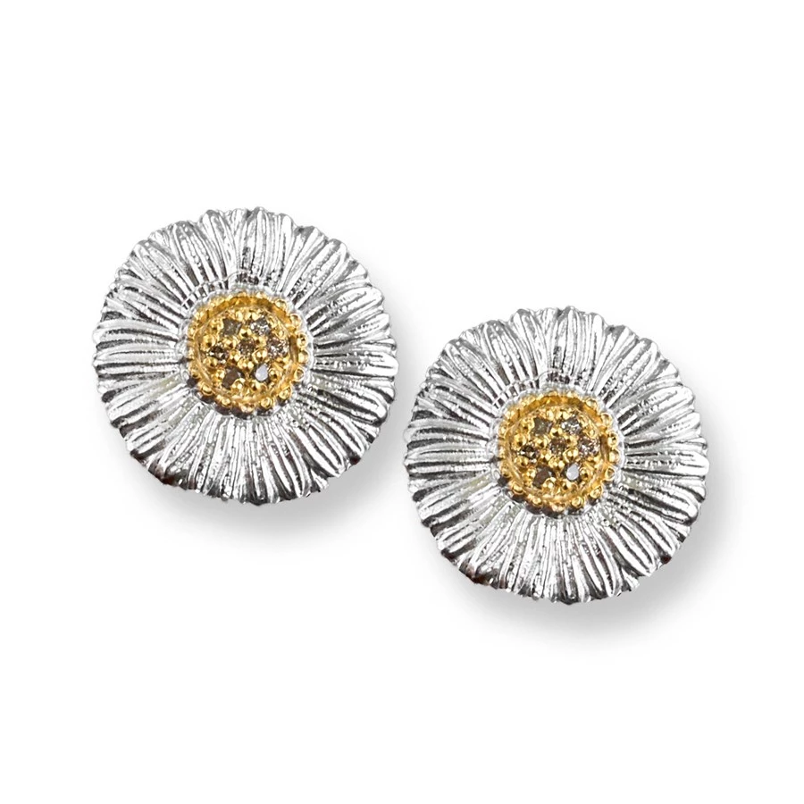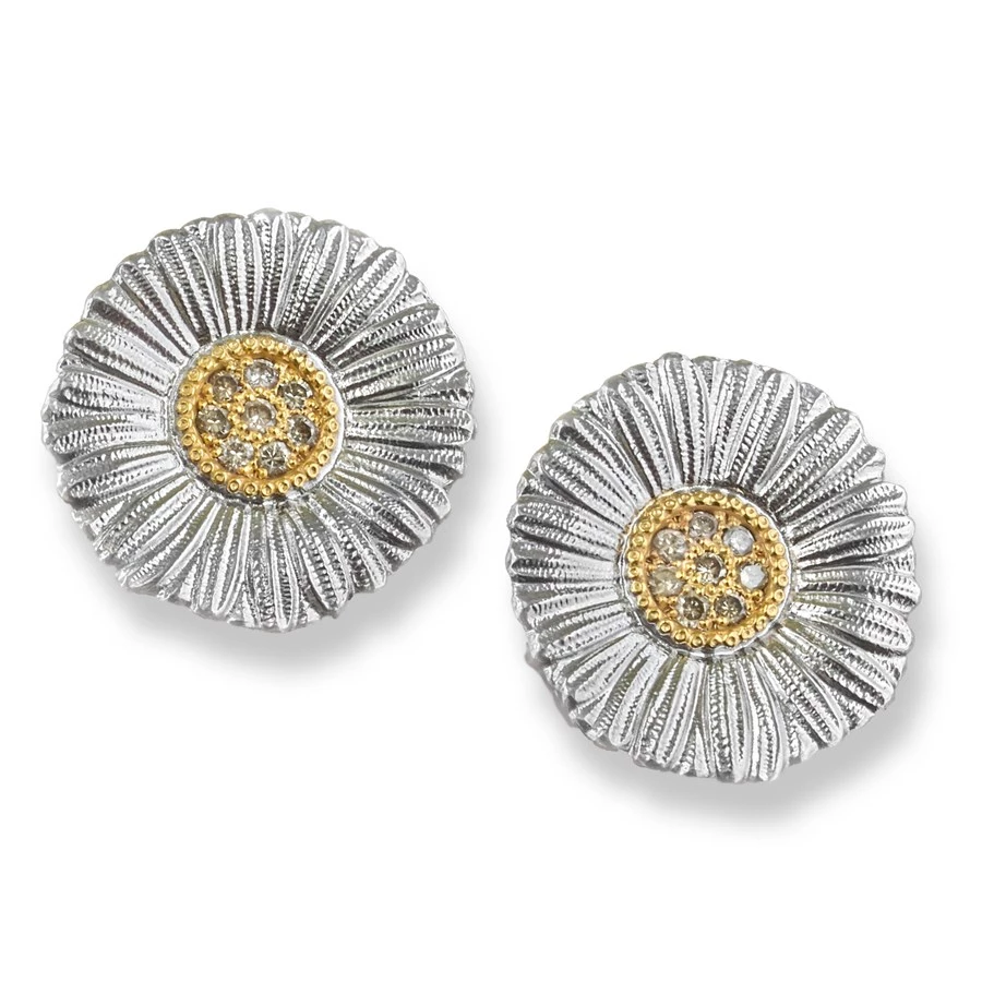 Sterling silver is skillfully manipulated by Bucellati silversmiths into the elegant Daisy Blossom motif, transformed into stunning earrings featuring 18k goldplated centers studded with brilliant brown diamonds. Famed for handmade jewelry and silver since the mid-18th century, Buccellati still produces in small workshops with skilled artisans considered to be the best in Italy. Earrings are available with posts only. Handmade in Italy.