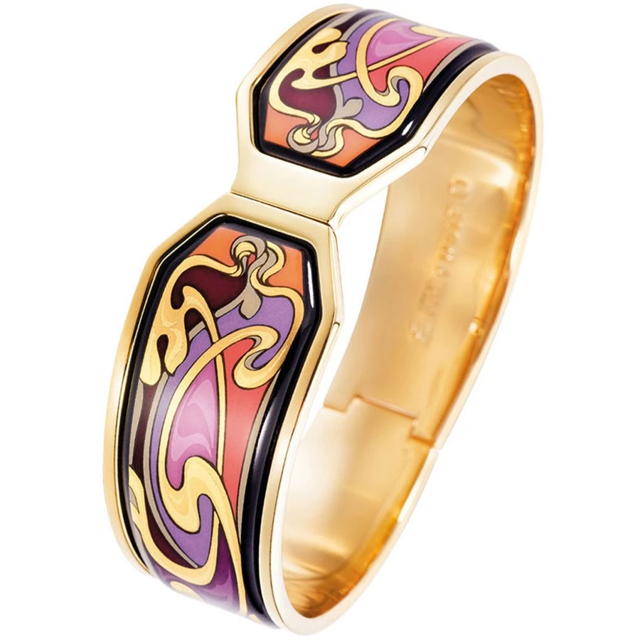 The clasp bangle Contessa is a bracelet that becomes more narrow towards the closure. Its sophisticated design makes it a timeless and beautiful highlight of any ensemble with bright 24k gold-plated accents. The hand-enameling is performed by artisans in Vienna, inspired by the Sarah Bernhardt works of Alphonse Mucha. Please review the Freywille Clasp Bangle Size Guide before ordering. Handmade in Austria.