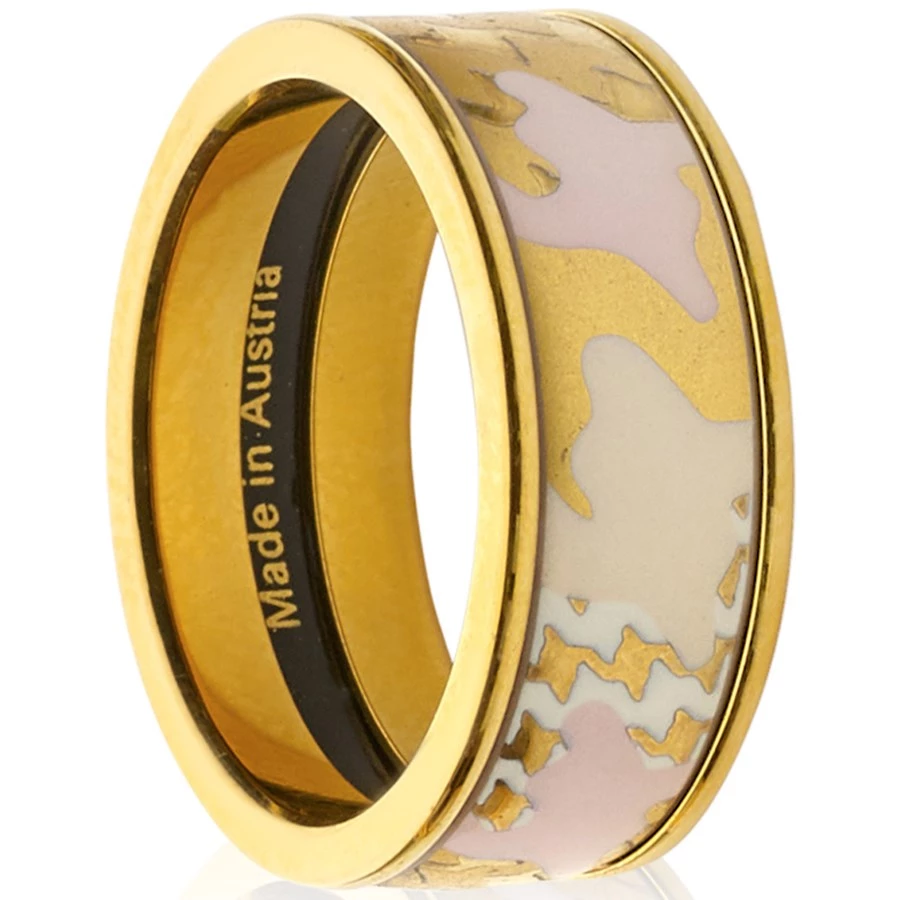 Artistically designed and fire-enameled in Austria by master artisans, these feminine hand-decorated rings are inspired by floral artworks, with pink enameled details. Each ring is enhanced with 24k goldplated accents. Made in Vienna.