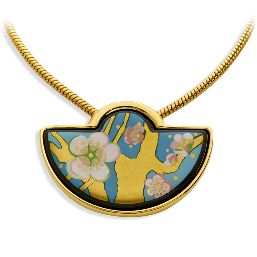 The heart of every Freywille jewelry piece is the distinctive and artistically designed fire enamel that is applied in many layers and then fired. Up to 100 manual steps are necessary to produce a delicate and color-intense fire enamel plate, which is then fixed into a mounting. The perfected technique and unique colors make the pieces shine with stunning unmistakable brilliance. These hand-decorated designs are inspired by the Almond Blossom by Vincent van Gogh. Made in Vienna.