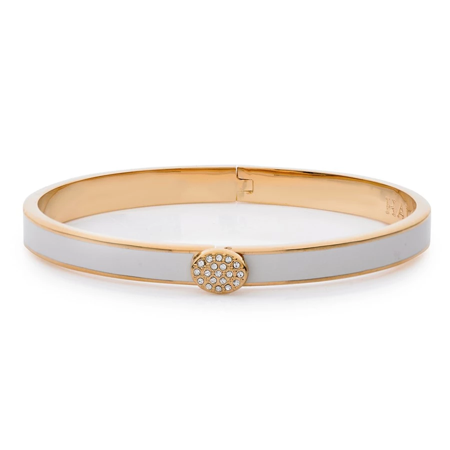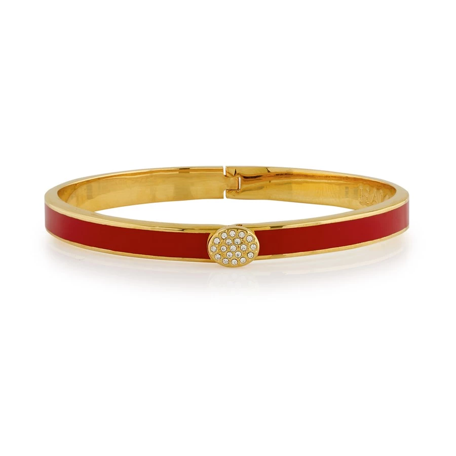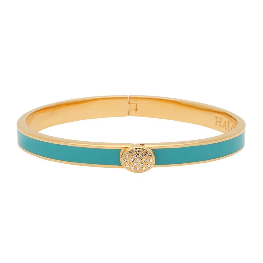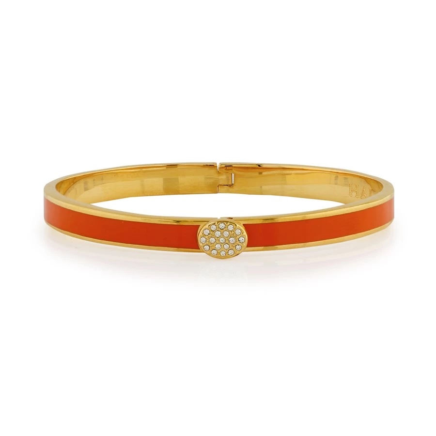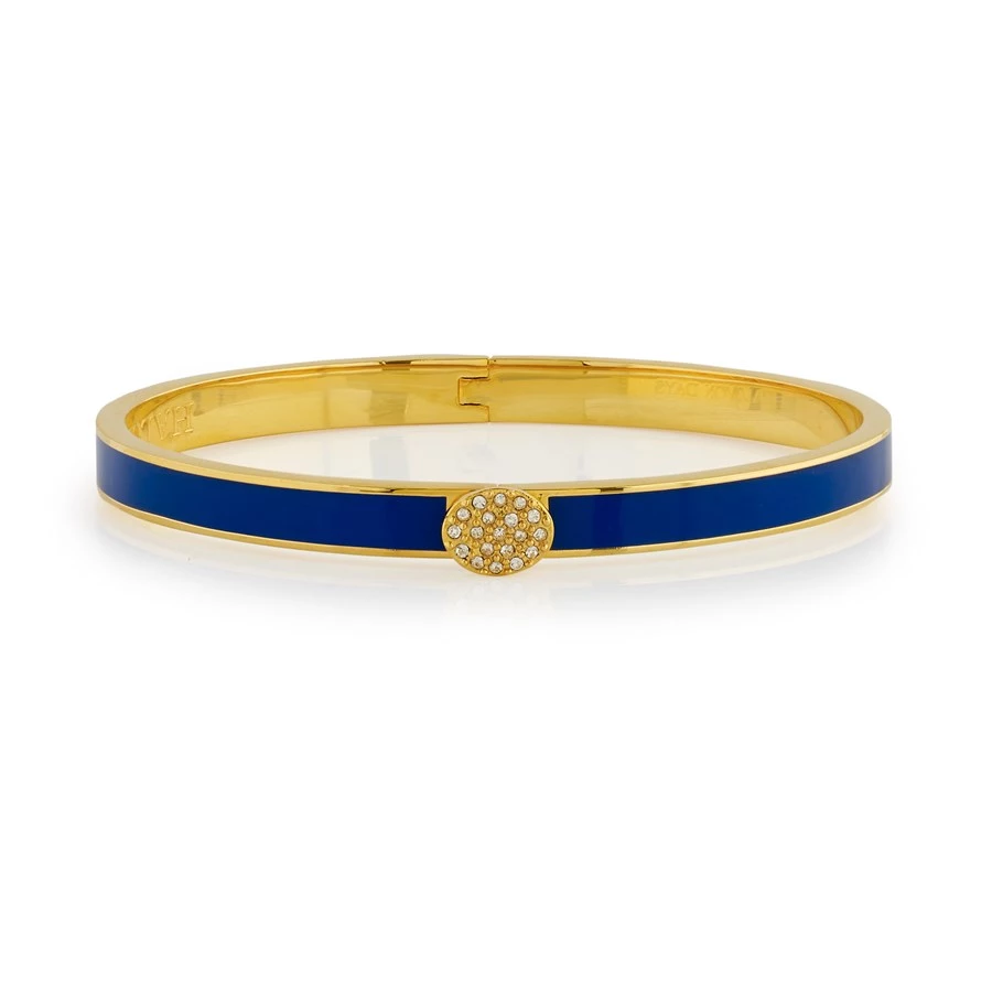 Halcyon Days Skinny Pave Hinged 6mm Bangles go through at least twenty three different stages of production to ensure the best quality product. Fashioned from brass, each bangle is plated with 18k gold and handpainted enamel finish for bold coloring and a glossy, vibrant finish.