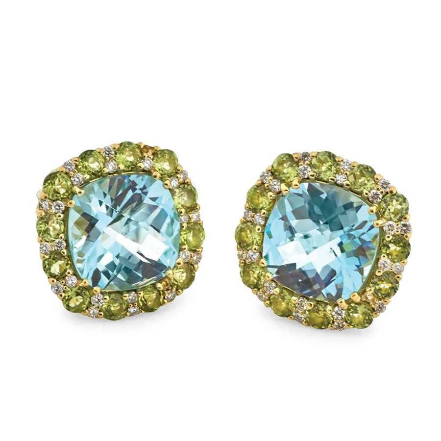 Elegant cushion-cut Light Swiss Blue Topaz (15.20 cts) is bordered by beautiful peridot (3.12 cts) and accented with diamonds (.48 cts), all set into 18k yellow gold. Handmade in America. Exclusively at Scully & Scully.