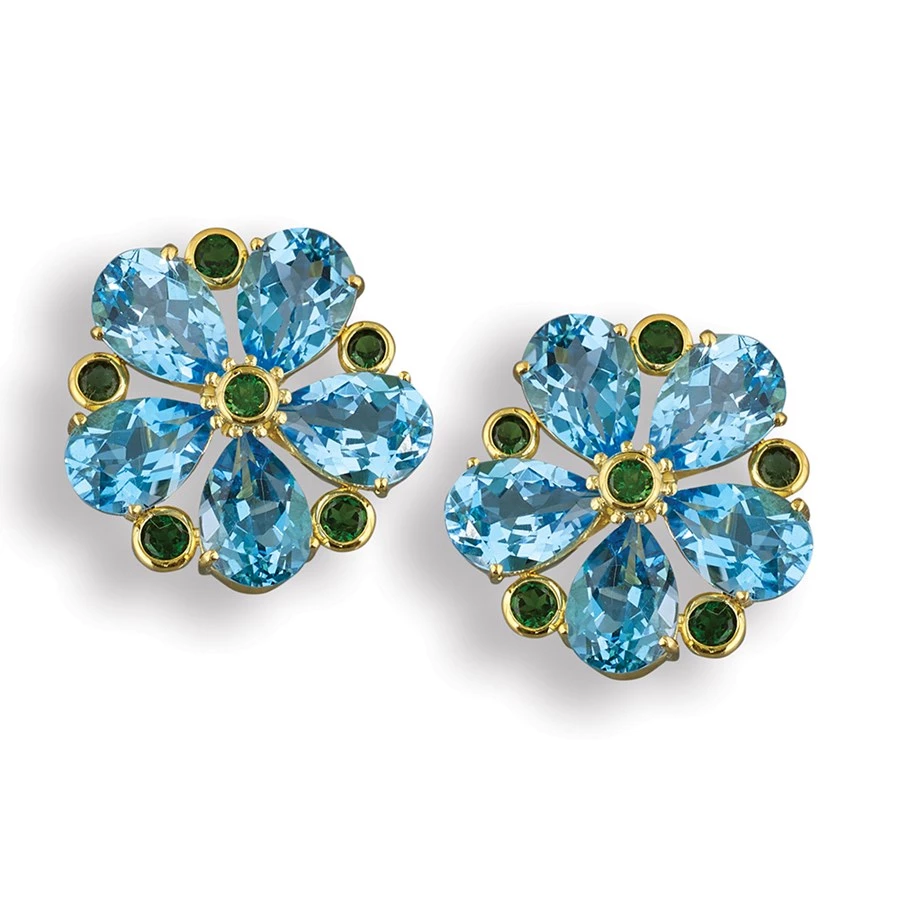 Handcrafted of 18k yellow gold, each earring features five faceted oval blue topaz (17 tcw) petals. The petals are accented by 6 faceted round green tsavorite (1 tcw). Handmade in America. Exclusively at Scully & Scully.