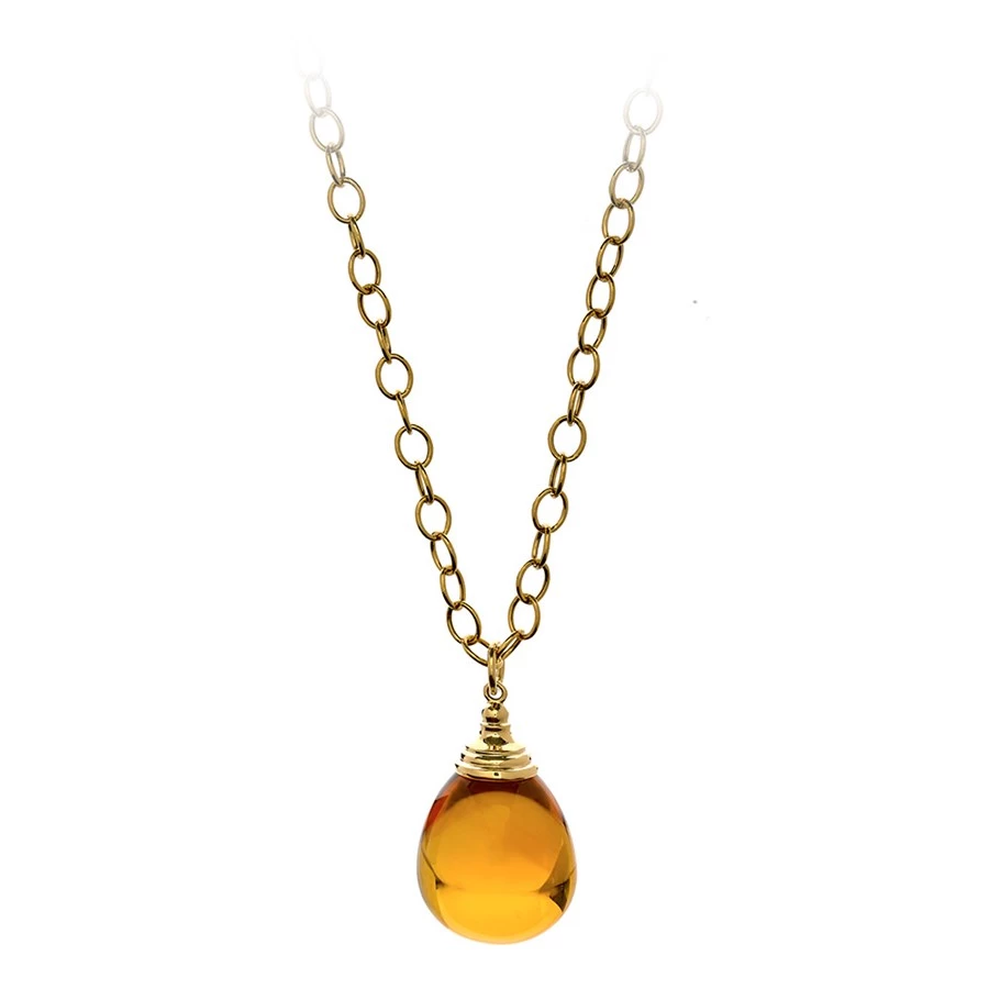With a handcrafted 18k Yellow Gold setting and optional 18k yellow gold oval link chain, this necklace features a beautiful 50 Carat Citrine Drop Pendant. Because each stone is natural madeira citrine sourced from Brazil, the color and texture may slightly vary. Handcarved and handmade in America. Exclusively at Scully & Scully.