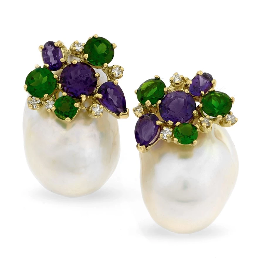 Beautiful gemstone clusters are prong set into 18k gold feature three round chrome diopside, one round, one pear, and one oval amethyst, accented with five pave diamonds (0.24 tcw). The beautiful gemstone cluster is then handset to crown each cultured Baroque pearl. Handmade in America. Baroque pearls will vary slightly in size and shape.