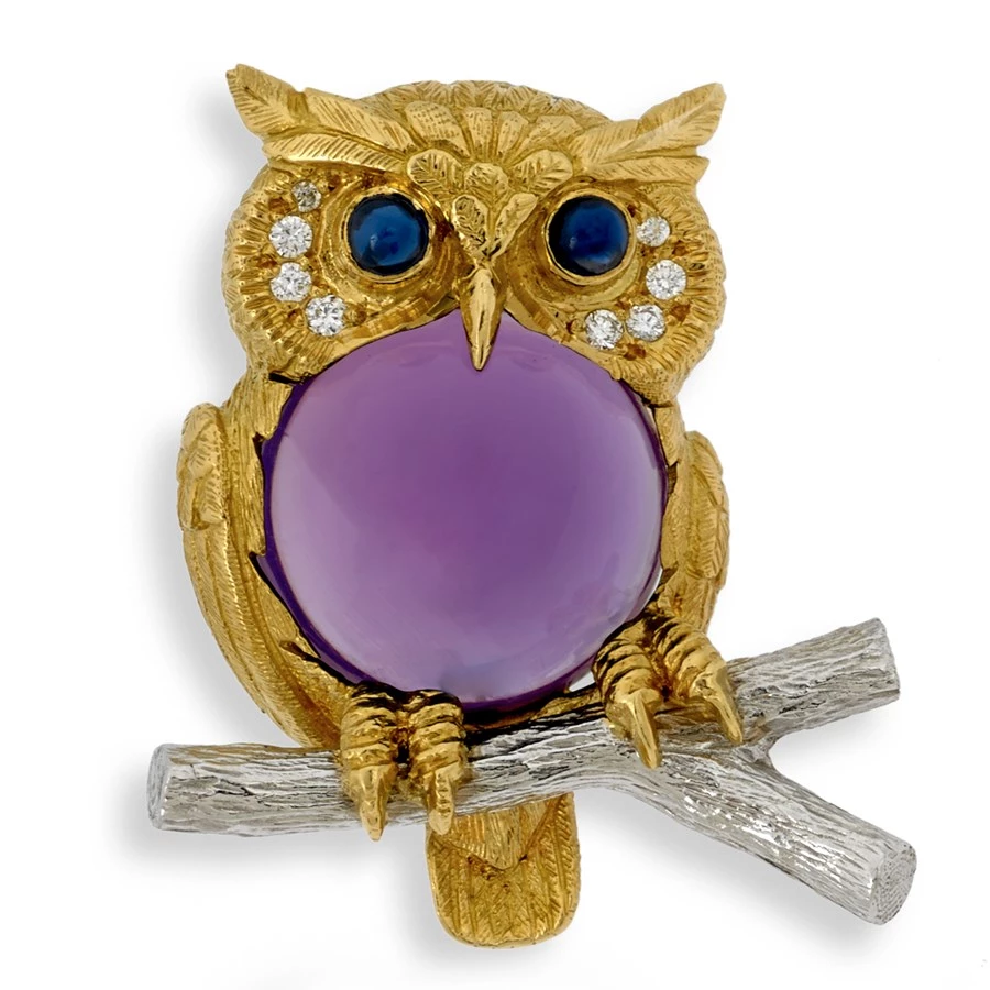 Wise owl is 18k yellow gold sitting on a white gold branch. Eyes are sapphires and body is a smooth, rich amethyst (6.24cts). Diamonds set into face are .08cts. Handmade in England. Exclusively at Scully & Scully.