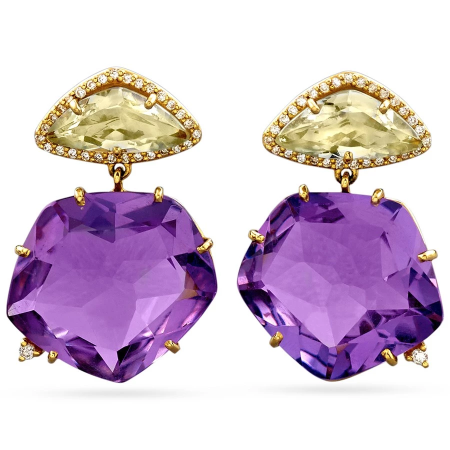 Stunning handmade earrings with deep purple amethyst drops and a bright prasiolite top (29.9 total cts). Prasiolite is set in an 18k gold diamond border (0.26 tcw).