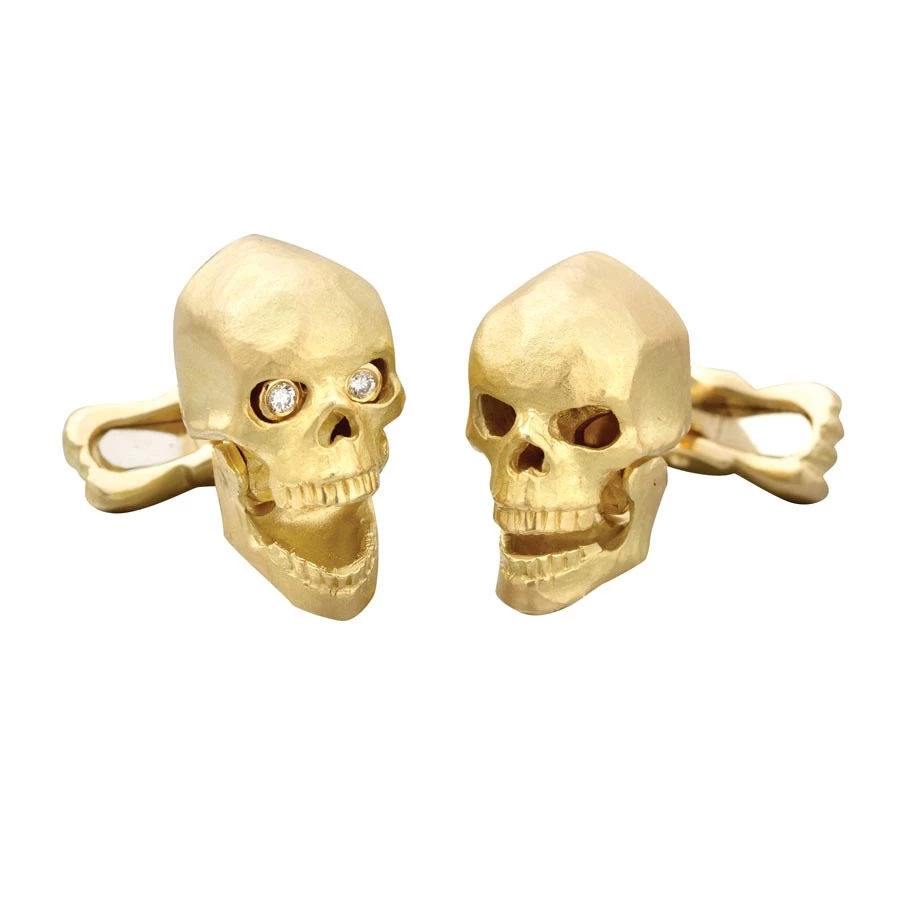 These cufflinks feature movable jaws and diamond eyes. When the jaw is closed the diamonds are recessed, but fill the eye sockets once the jaw is opened. The T-bar is designed to resemble crossed bones – a guaranteed way to add a playfully-spooky touch to your formal look. Handmade in England.