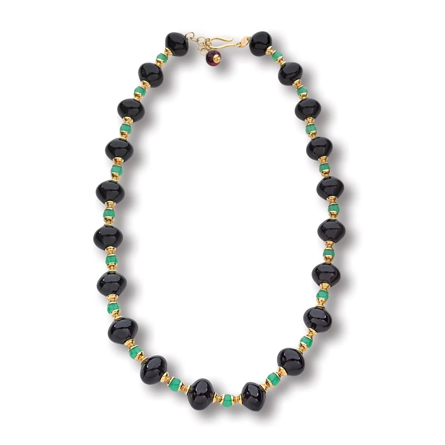 Handcarved black onyx beads (11.5mm x 10mm) with chrysoprase beads (4.5mm) and 18k yellow gold hourglass roundels. 18k yellow gold and tourmaline bead clasp (7mm). Because these are natural stones, colors may vary slightly. Handmade in America. Exclusively at Scully & Scully.