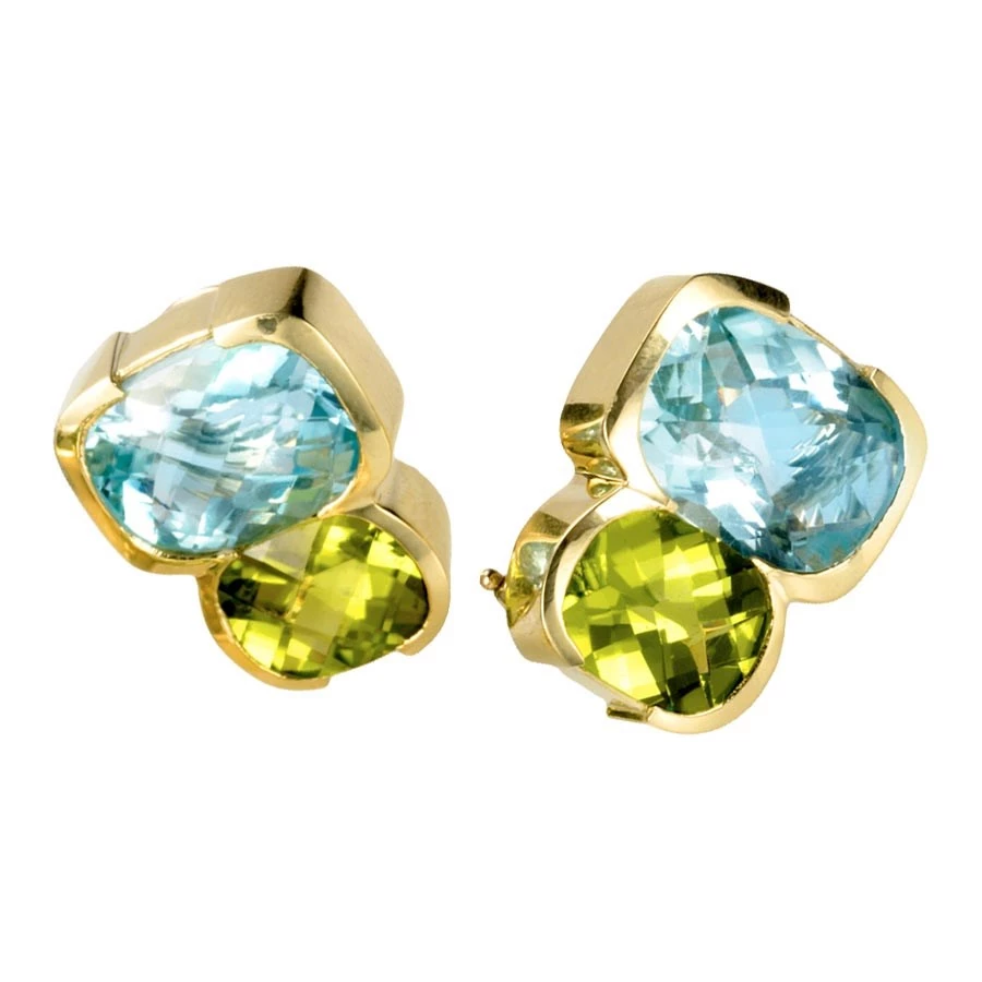 Faceted blue topaz and peridot earrings are bezel set by hand into timeless 18k yellow gold. Handmade in America. Posts only.