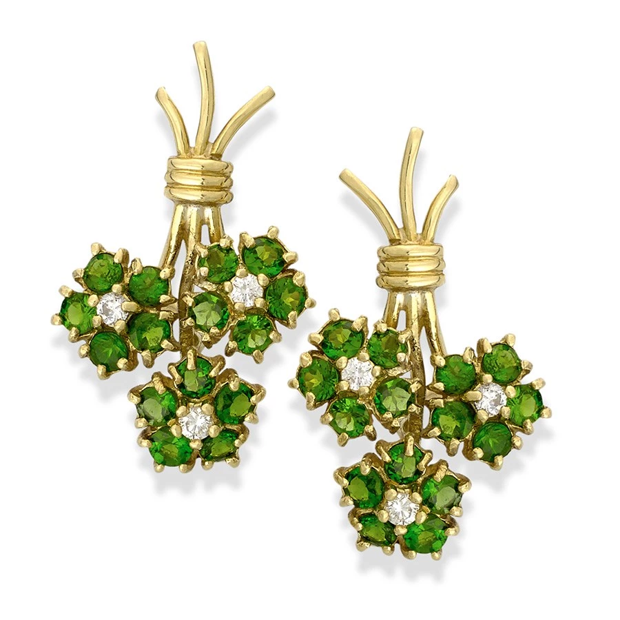 These stunning 18 karat yellow gold bouquet cluster earrings feature vibrant chrome diopside and brilliant white diamonds. Bouquet clusters are meant to be worn upside down on the ear lobe. Handmade in America. Exclusively at Scully & Scully.