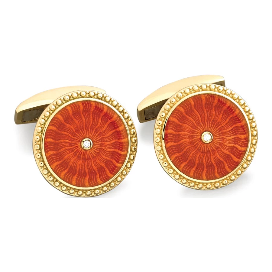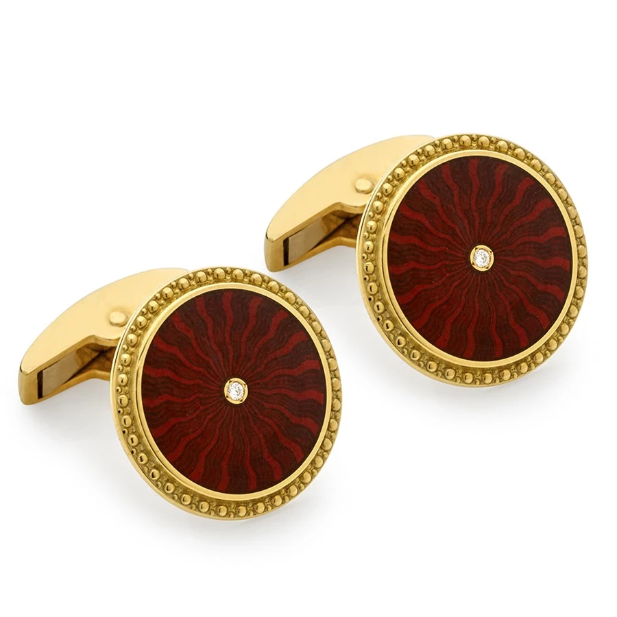 Beautiful enamel cufflinks inset in 18k yellow gold with dazzling diamond centers. Handmade in England with sugarloaf closures.Â