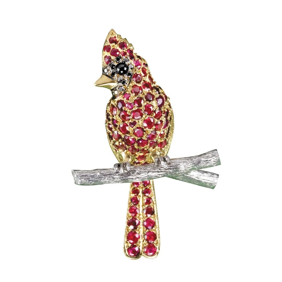 This striking pin is fashioned of rubies (3.78 cts) and black diamonds (.17 tcw) set into 18k gold with black rhodium detail. Handmade in England. Exclusively at Scully & Scully.