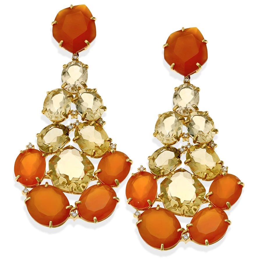 These mesmerizing chandelier earrings are carefully crafted of orange carnelian and off-white & yellow citrine (40 tcw). Scintillating diamonds (.136 tcw) are interspersed within the stones. Handmade in Brazil.