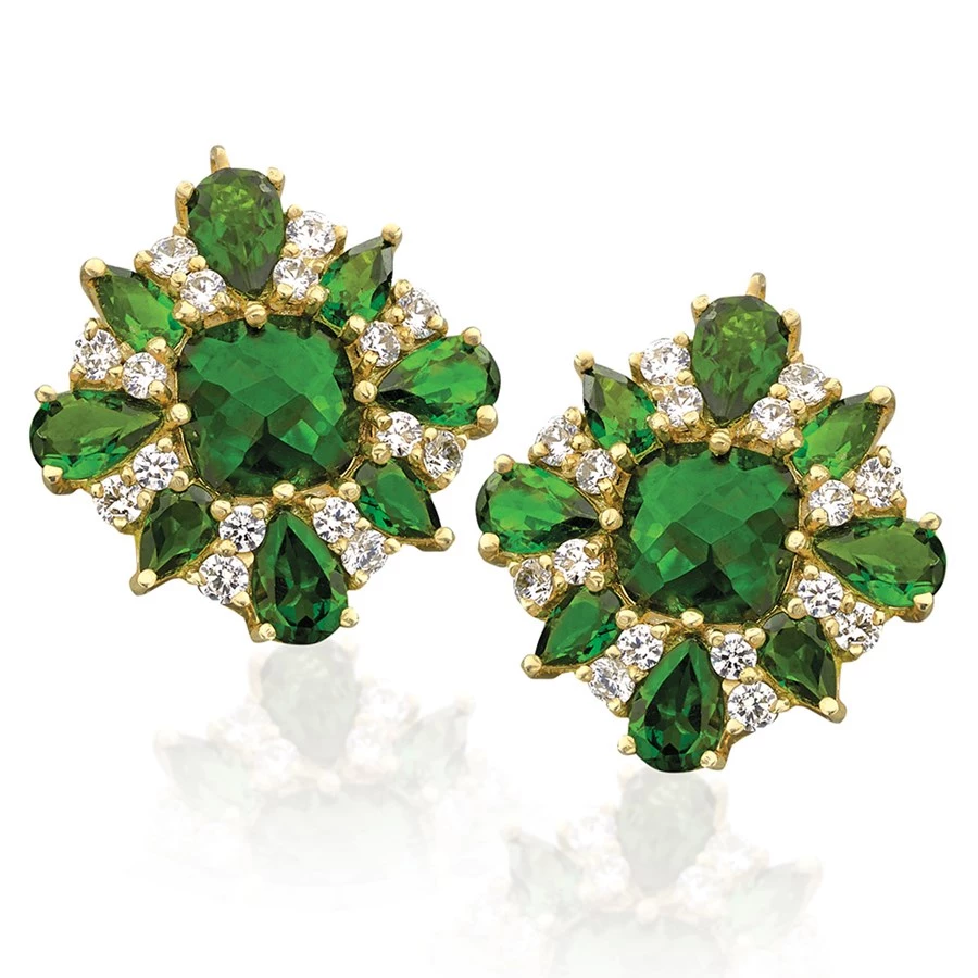 Handcrafted of 18k yellow gold, these stunning earrings feature clusters of faceted green chrome diopside gemstones (9.10 tcw) and faceted round diamonds (1.12 tcw). Each gemstone is prong-set by hand into the yellow gold earrings. Handmade in America. Exclusively at Scully & Scully.Â