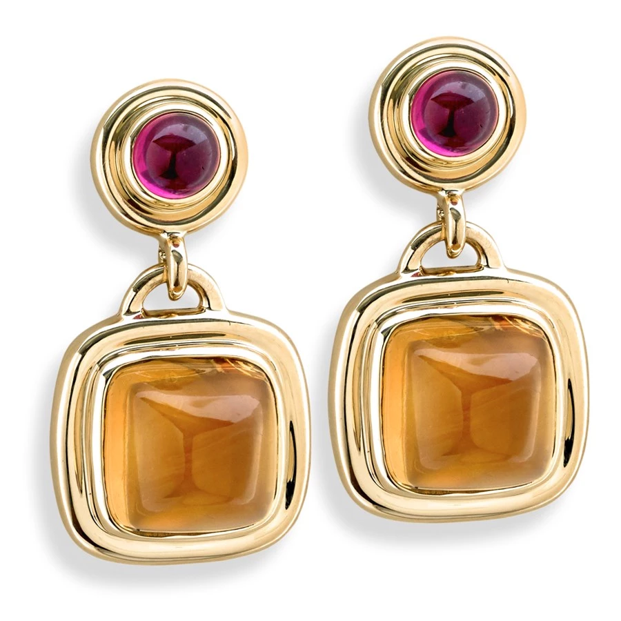 18k yellow gold with handcarved citrine sugarloaf cabochons and rubellite (1 tcw). Because these stones are natural, color and texture may slightly vary. Handmade in America. Exclusively at Scully & Scully. Posts only.