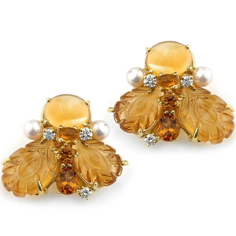 Deftly detailed and finely crafted bee earrings perfect for someone sweet. The wings are made of carefully carved citrine and the body is constructed of two oval cut and one round faceted citrine gemstones. The head is a beautiful citrine cabochon, offset by two cultured pearls. Each bee is finished with three diamond accents. Each piece is prong-set by hand into 18k yellow gold. Handmade in America.