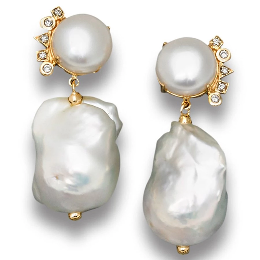 A freshwater pearl is encrusted in a unique 18-karat gold four prong setting embellished with a dainty geometric diamond detail (0.11 tcw). Dangling from these posts are a pair of unique Baroque Pearls (12-15mm long). These Art Deco inspired statement earrings are ideal to wear for a special occasion. Handmade in America.