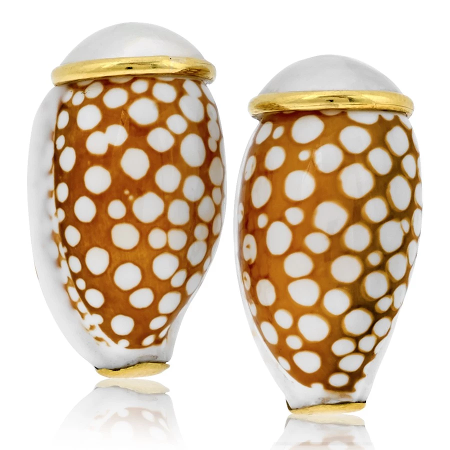 These beautiful creamy shells are adorned with white glass pearls atop. The shells have a polished finish and is ideal for a beach wedding or party. The shells are carefully attached by handcrafted 18k yellow gold. Handmade in America.