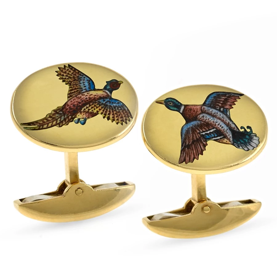18k yellow gold with handpainted game birds in flight. One cufflink shows a pheasant, the other a duck. Sugarloaf style fittings.