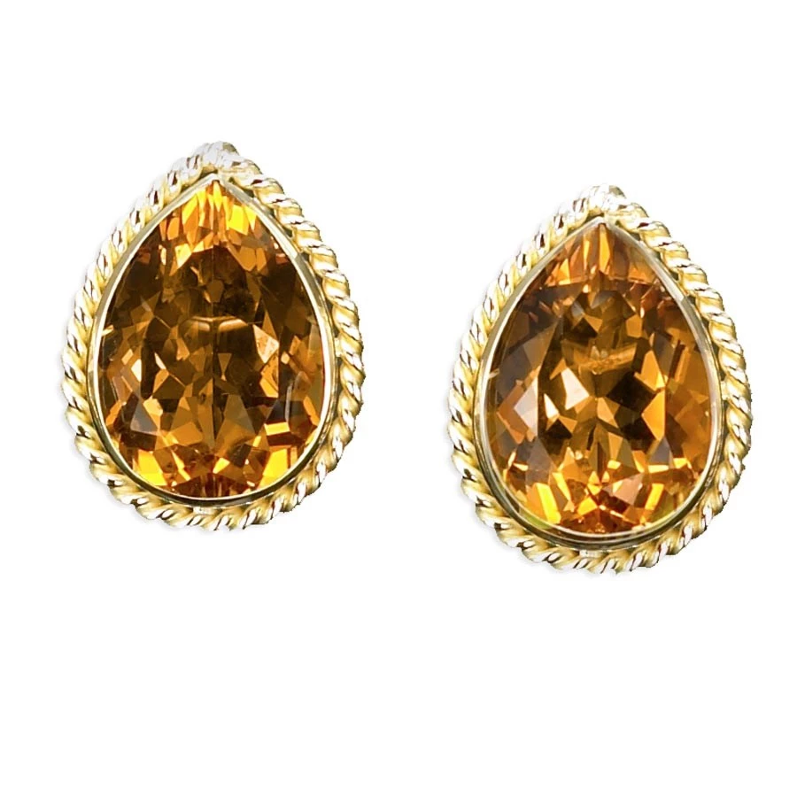 Brilliant raindrop earrings with a large dark citrine stone set in 18k gold with a wreath-patterned border. Handmade in America. Posts only.Â