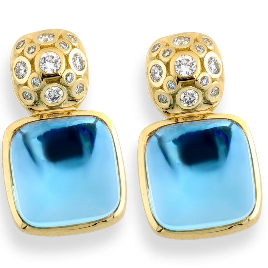 Regal pair of champagne diamond (0.30 tcw) earrings, with a beautiful blue topaz (15 tcw) drop. Each gemstone is bezel-set into timeless handcrafted 18k yellow gold. A perfect pair for special events and for everyday elegance! Handmade in America. Exclusively at Scully & Scully.