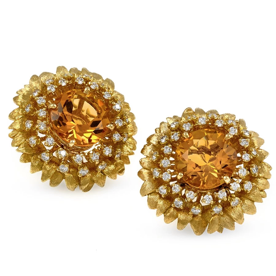 18k yellow gold is painstakingly hand-engraved with elegant texturing on each petal. The handcrafted yellow gold petals provide the perfect backdrop to gorgeous round cut faceted golden citrine gemstones and dazzling diamonds, all prong-set by hand. Handmade in America. Clips only.