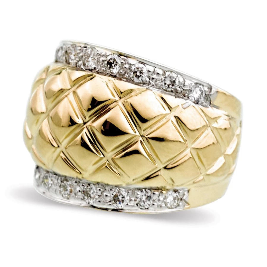 Stunning 18k yellow gold ring with puffed quilted pattern accented by pave diamonds (.54 tcw) for an eye-catching design. Handmade in America.