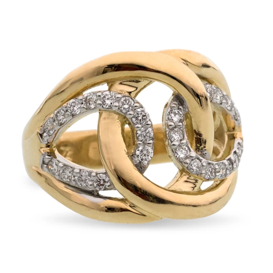 This sumptuous ring features a unique eternity design, consisting of four interlocking branches of 18k gold. The two smaller loops are accented with dazzling diamonds (0.52 tcw), all prong-set by hand into the yellow gold. Handmade in America.