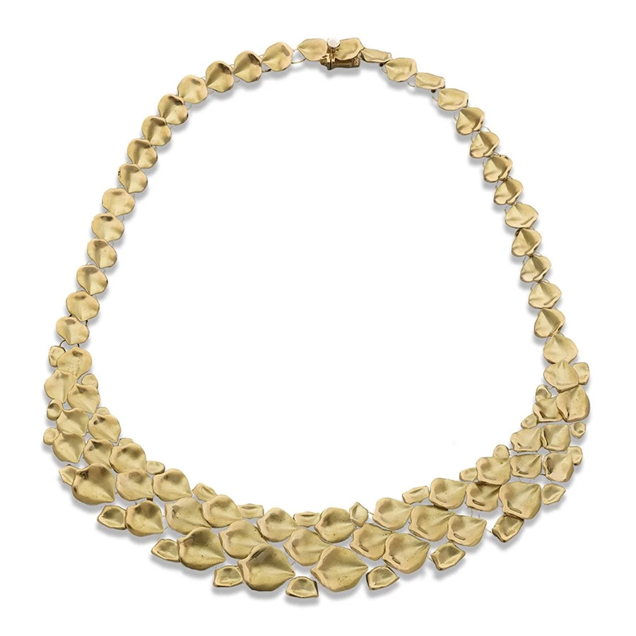 18k yellow gold is beautifully handcrafted into detailed flower petals, delicately linked by filigree creating the illusion of petals fluttering across the neckline. Handmade in Italy.