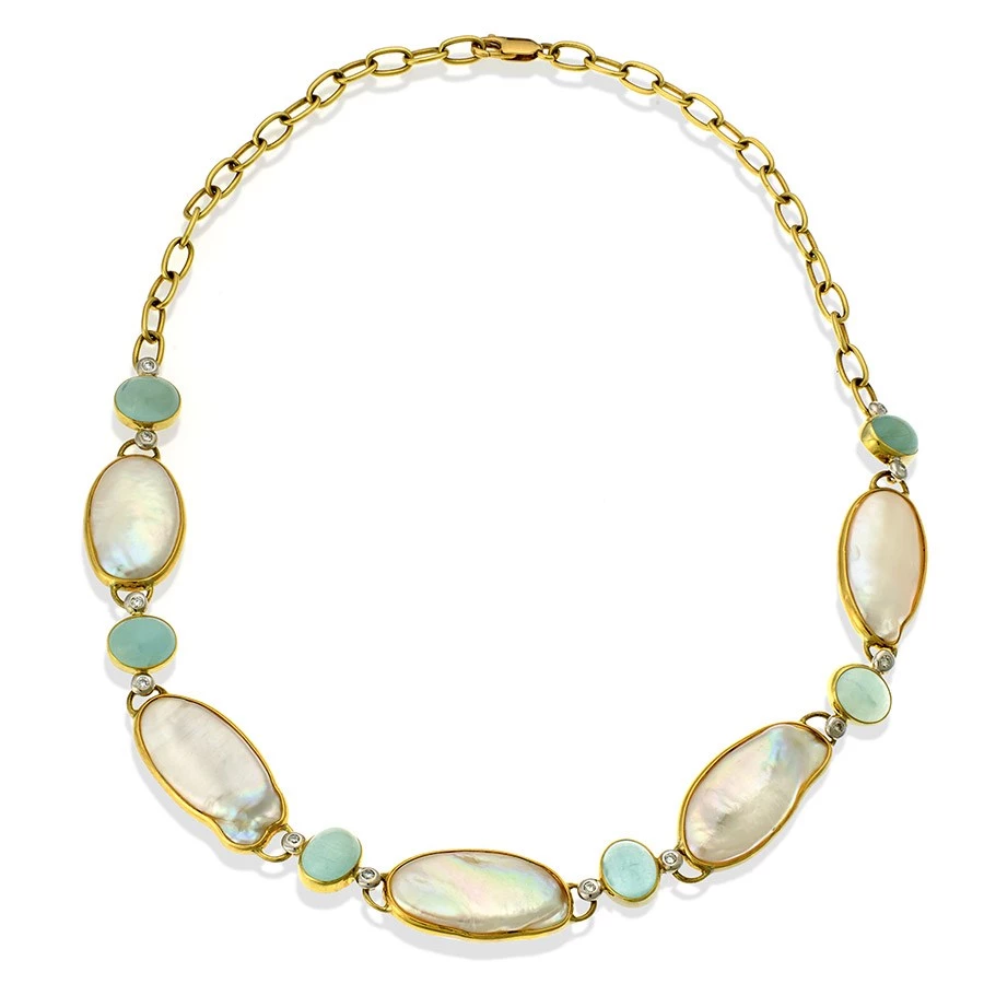 Five iridescent freeform freshwater pearls and six cabochon aquamarines set in 18k gold. Each aquamarine is accompanied by a pair of brilliant diamonds (0.30 tcw). Necklace chain is also 18k gold. Handmade in America.
