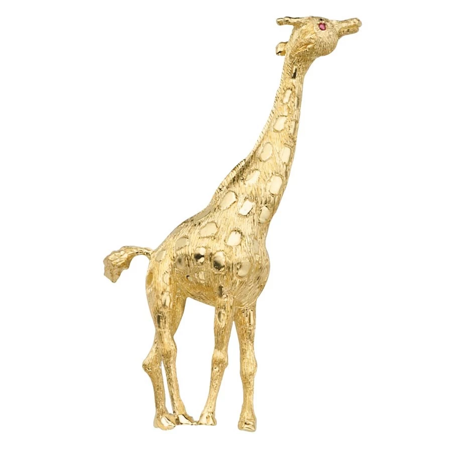 Show your love for the tallest mammal on Earth with our 18-karat yellow gold giraffe pin! Each has beautiful ruby eyes and a bright-cut finish that is hand-done, available with smooth gold or enameled markings. Handmade in America.