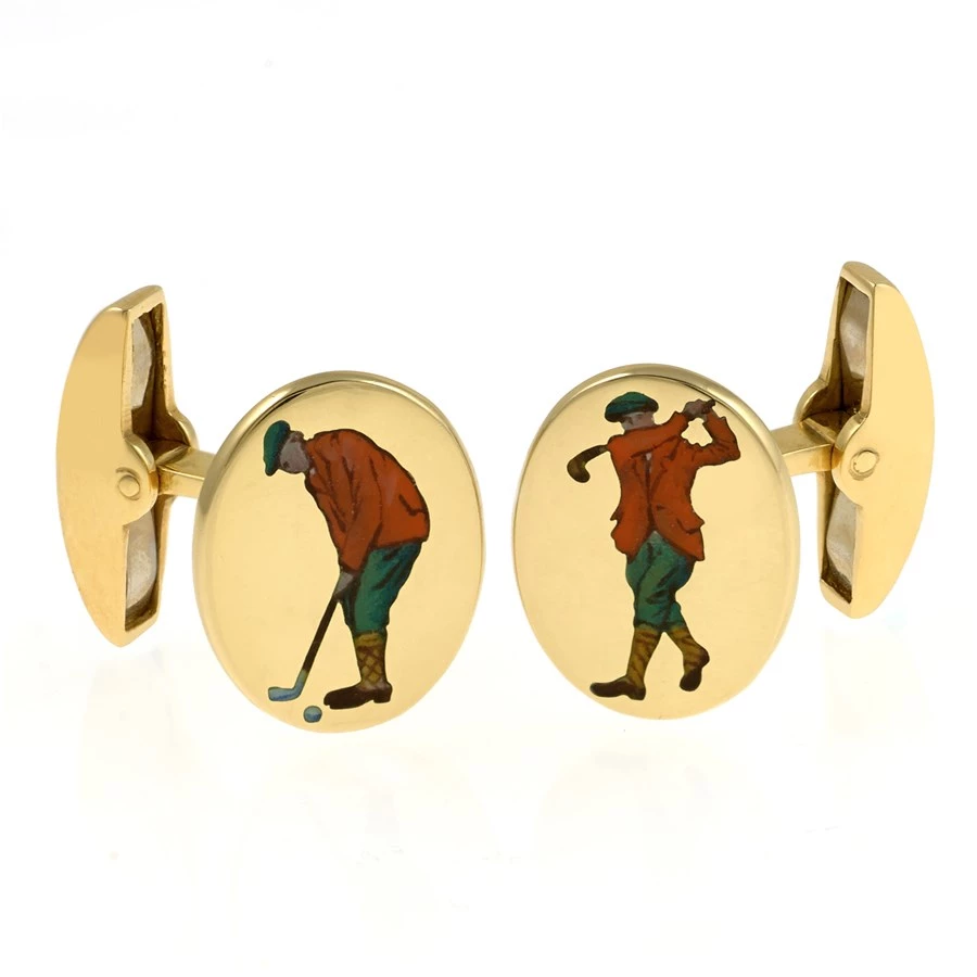 18k yellow gold cufflinks show a handpainted golfer taking a swing and teeing up for a put. Handmade in England.