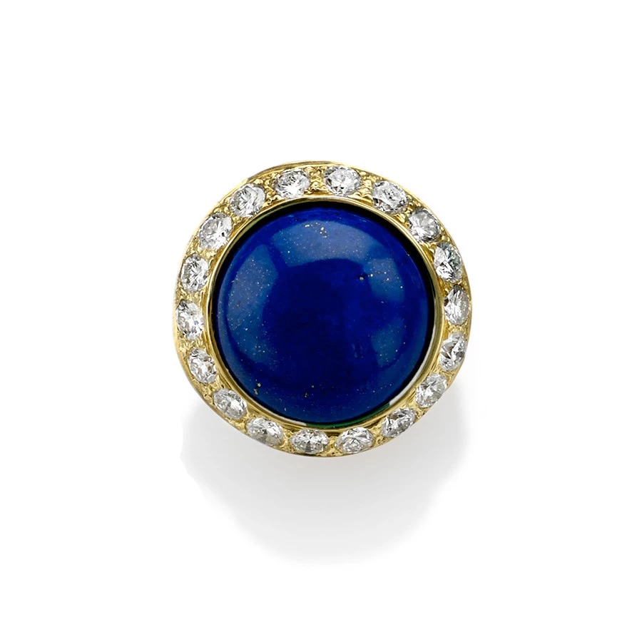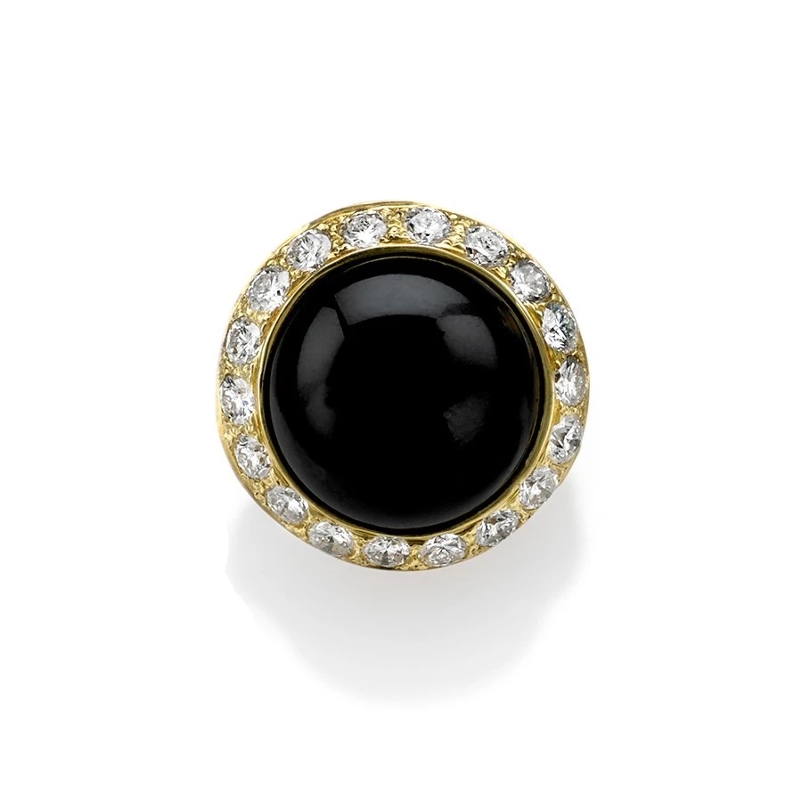 A remarkable ring with 18k gold, 1.26 carats of pave diamonds, and a 14mm mabe pearl. The pearl can easily be removed and replaced with another gemstone insert. Inserts are sold separately and include royal blue lapis, jet black onyx, and brilliant turquoise. Ring measures approximately ¾” diameter. Handmade in America.