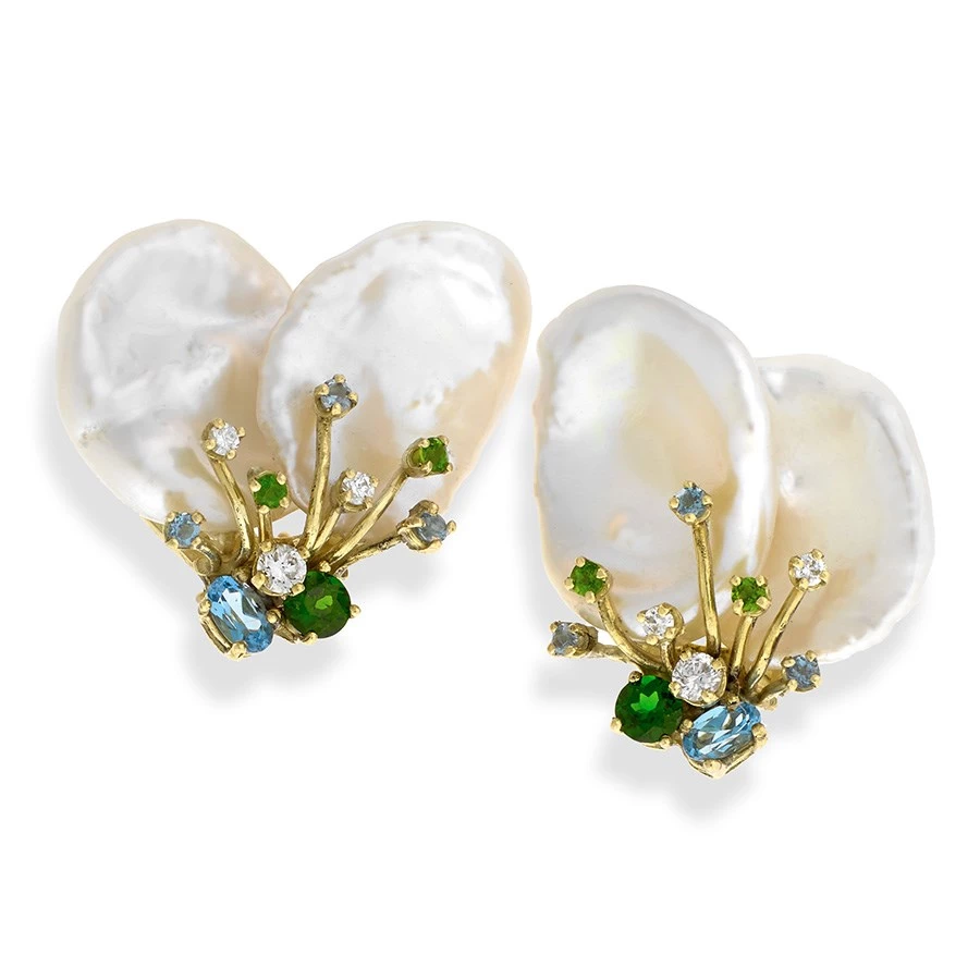Cultured Keshi pearls with faceted sky blue topaz (1.60 cts), chrome diopside (.62 tcw) and diamonds (.32 tcw) set into 18k yellow gold. Handmade in America. Exclusively at Scully & Scully.