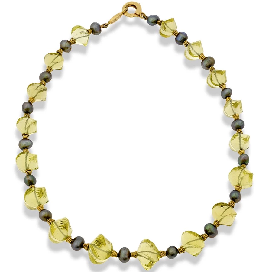 18 mysterious cabochon black freshwater pearls and 18k yellow gold support stunning graduated checkerboard faceted lemon quartz lanterns (⅝” square). Handmade in America. Exclusively at Scully & Scully.