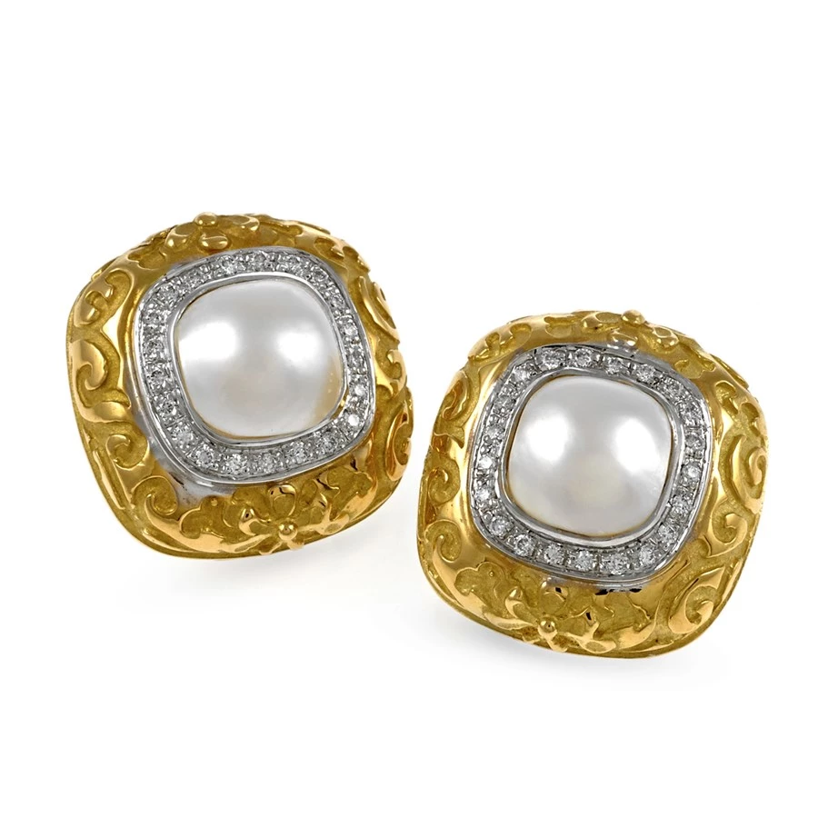 Elegant square earrings fashioned from pure 18k yellow gold. The earrings feature a highly-detailed and hand etched border with a mabe pearl center surrounded by a halo of pave diamonds (.30 tcw) set into 18k white gold. Handmade in America.