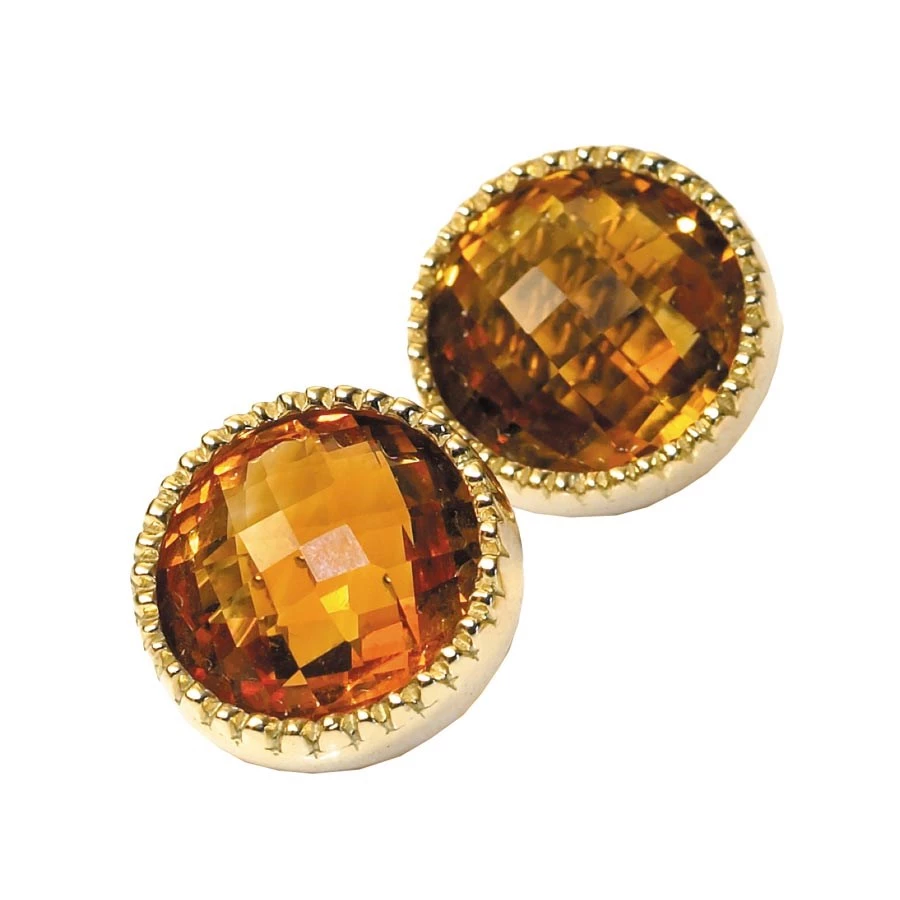 Stunning 16mm Madeira citrine gemstones are bezel set in 18k gold with beaded borders, these earrings provide a rich accent of color for day or evening. Handmade in America.
