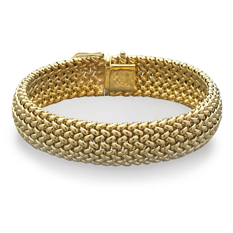 Elegant and sophisticated bracelet. 18k yellow gold is handcrafted into intricate bands on granulation. Box clip closure with tongue and safety clasps. Handmade in Italy.