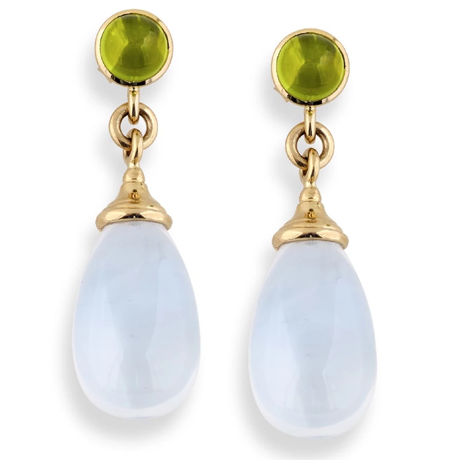 Round polished peridot (2.5 tcw) anchor the handcarved earrings, with 18k yellow gold suspending gorgeous moon quartz drops (50 tcw). Because these stones are natural, color and texture may slightly vary. Handmade in America. Exclusively at Scully & Scully. Posts Only.