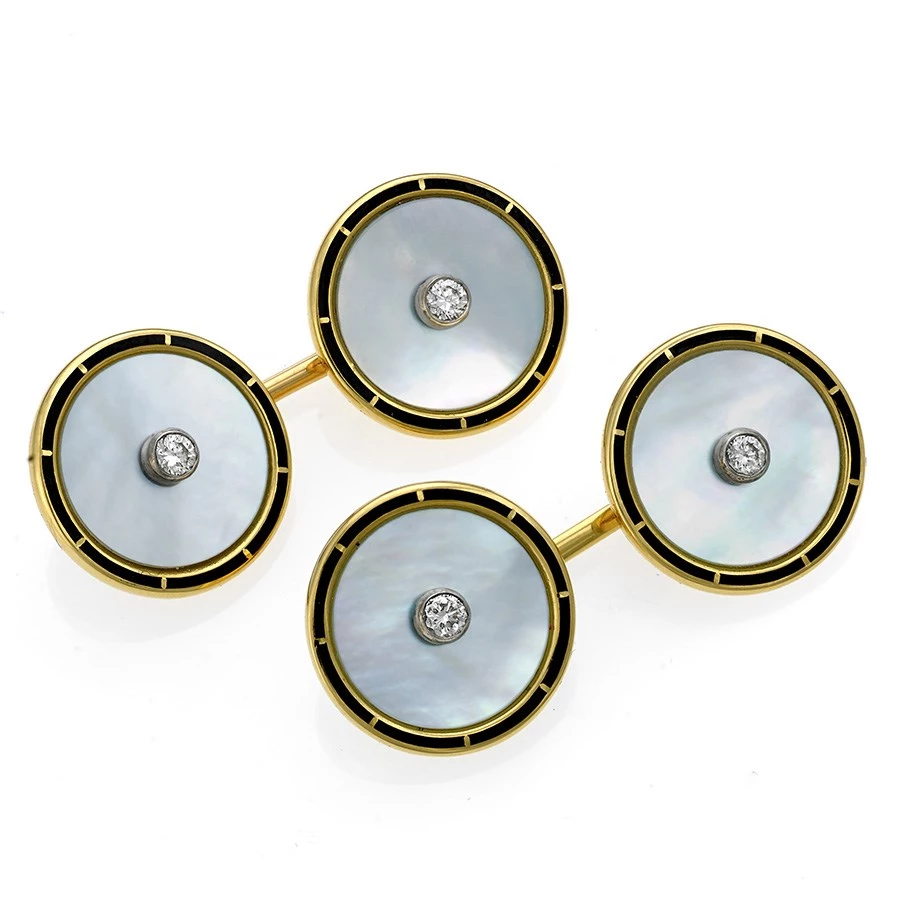 Dazzling cufflinks with lustrous mother of pearl and a black vitreous enamel border. The centers are diamond (0.20 tcw) in an 18k gold bezel setting. Handmade in England.
