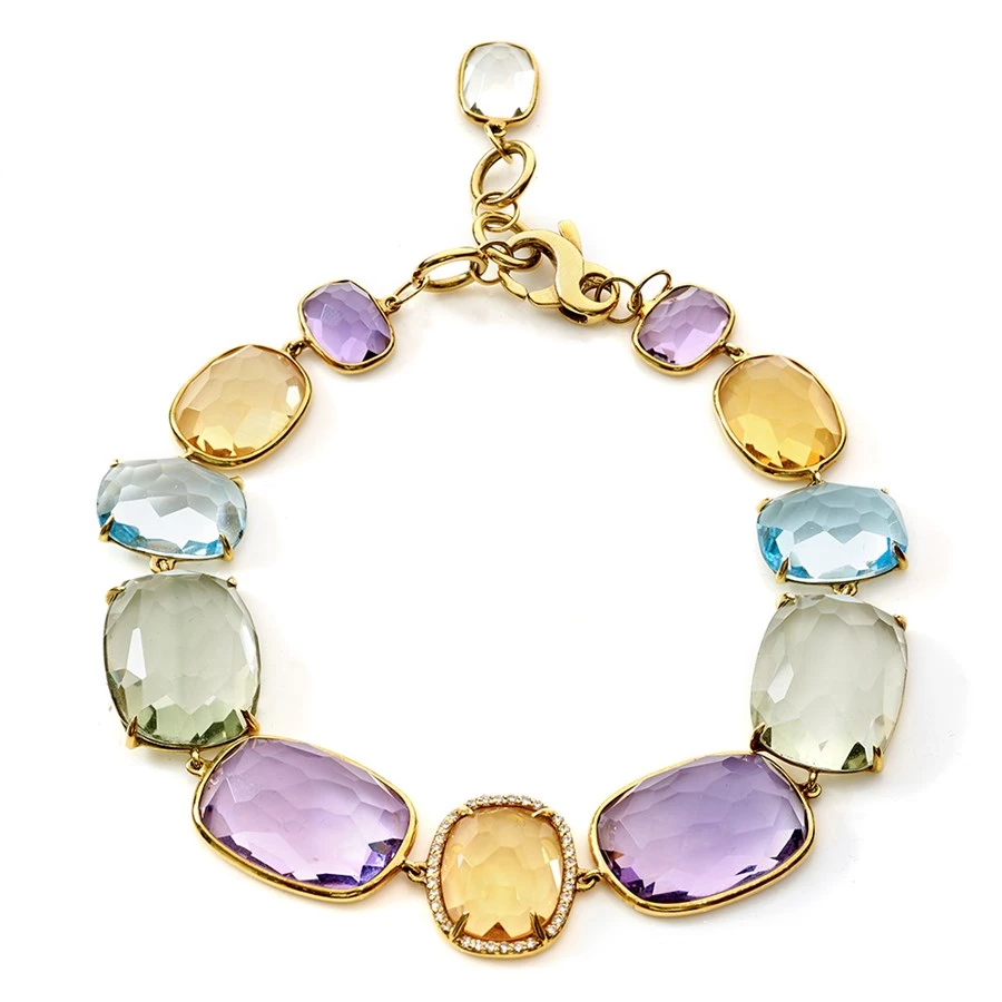A stunning and colorful yellow gold bracelet perfect for any occasion! It consists of oval faceted multi-color amethyst, blue topaz, critrine, and prasiolite gemstones (89.62 tcw). The center citrine boasts a halo of pave diamond (0.204 tcw). Each gemstone is prong-set by hand into 18k yellow gold. Handmade in Brazil.