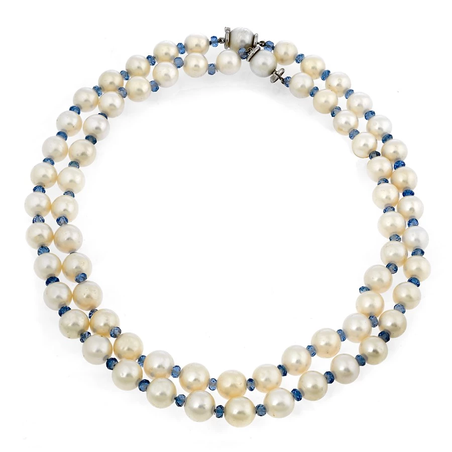 A pair of nesting necklaces of 10.5-11mm white freshwater pearls accented with small blue topaz beads. The 18k yellow gold plunger clasp allows the two 18″ necklaces to be joined together into one one single 36″ necklace. Hand strung on silk cord. Handmade in America.