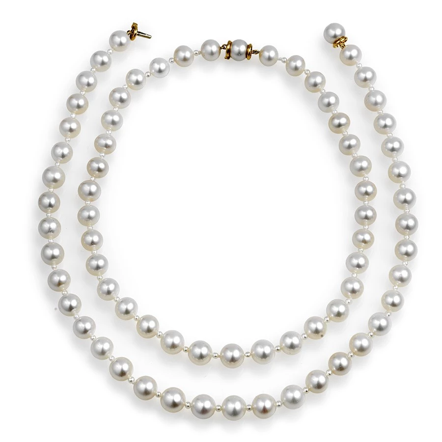 A pair of nesting necklaces of 10.5-11mm white freshwater pearls accented with small white seed pearls. The 18k yellow gold plunger clasp allows the two 18″ necklaces to be joined together into one one single 36″ necklace. Hand strung on silk cord. Handmade in America.