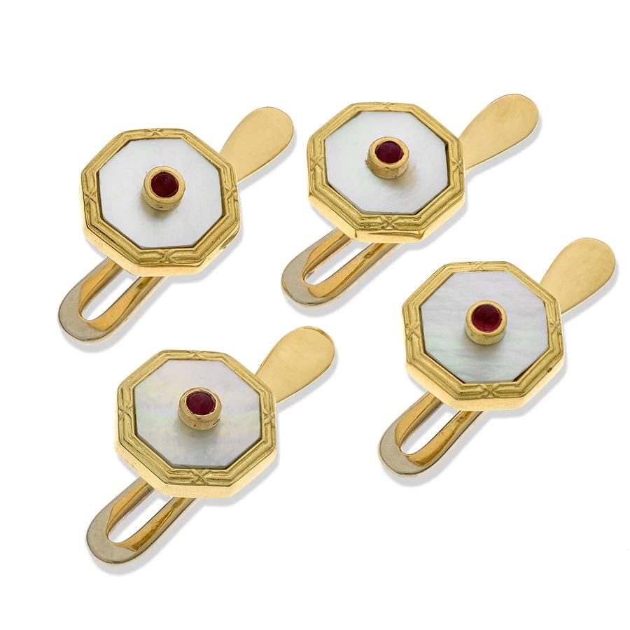 Scully & Scully 18k Gold Octagonal Studs With Mother Of Pearl & Ruby Center, Set Of 4