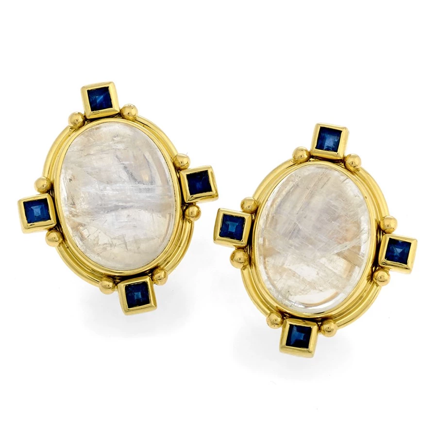 Mysterious oval moonstone cabochons are handset into 18k gold. Each side is accented with square cut sapphires, balancing the opalescent white with rich blue sparkles. Made in America.