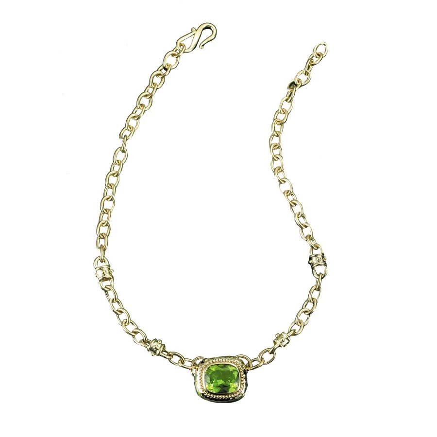 This necklace boasts a gorgeous peridot cushion centerpiece (â…ž” x ¾”), set into 18k gold chain link. Necklaces fastens at the reverse with an S-hook. Handmade in America.