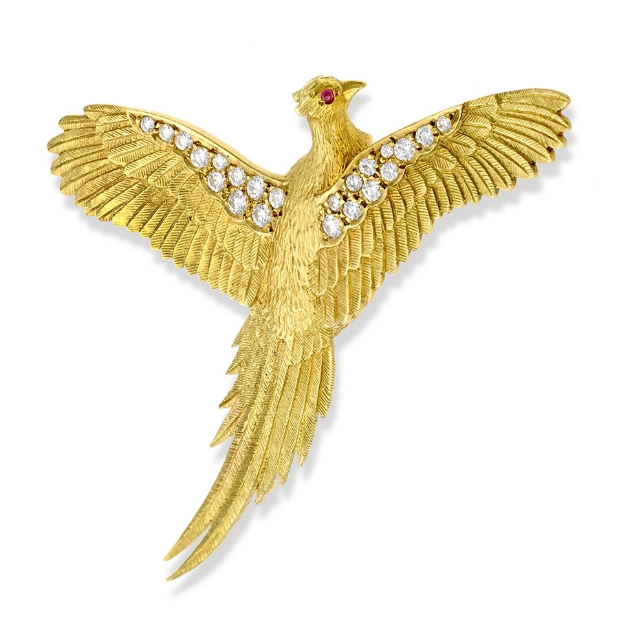 A remarkable pin featuring a majestic pheasant with wings spread. The bird has fiery ruby eyes, and a field of diamonds (0.56 tcw) adorns its wings. Handmade in England. Exclusively at Scully & Scully.