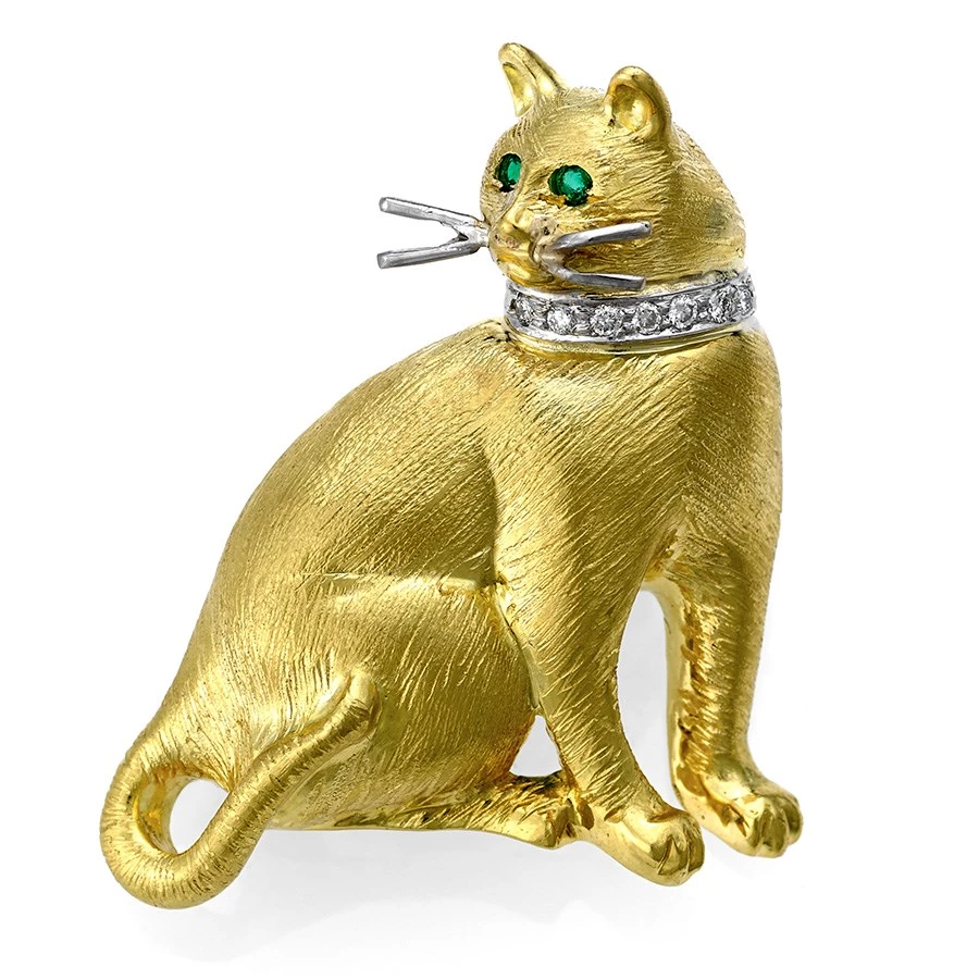 Elegant satin cat pin with 18k yellow and white gold. The cat’s eyes are deep emerald and sparkling diamonds (0.08 tcw) adorn its collar. Handmade in America.