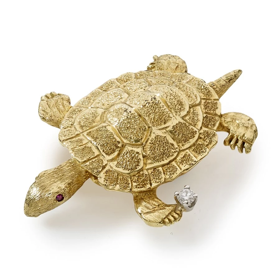Highly textured 18k gold with a .05 ct diamond, and ruby eyes. Handmade in America.